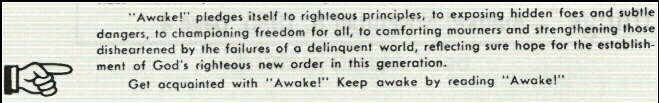 Watchtower magazine change the beliefs of Jehovah’s Witnesses concerning "the generation that saw the events of 1914," and the November 8, 1995 Awake! drops that magazine’s long-standing prophecy.Ever since the late 1940’s Awake! magazine had been promising the "sure hope for the establishment of a righteous New World" on page 2 of each issue. Then in 1964 it added the thought that this would happen "in this generation"—" reflecting sure hope for the establishment of God’s righteous new order in this generation."