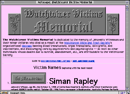 "dedicated to the memory of Jehovah's Witnesses and their minor children who died as a result of the Watchtower Bible and Tract Society's organizational decrees banning blood transfusions, organ transplants and skin grafts (1967-1980), and vaccinations, and discouraging care by psychiatrists and psychologists - as well as other individuals whose deaths due to suicide, abandonment, etc., are attributable to the Watchtower Society."Adorned with virtual "stone" markers and plaques, the Watchtower Victims Memorial website resembles a real-life cemetery. Sixty-three names are listed so far, most documented from published news reports. The website is a work in progress with a footnote indicating that the names listed "constitute only a small sampling of the victims who should be included" according to published statistics on the number of sect members rejecting transfusions. An online form allows visitors to add additional names. An electronic counter shows 3515 visitors since we created the Memorial website less than 2 months ago.